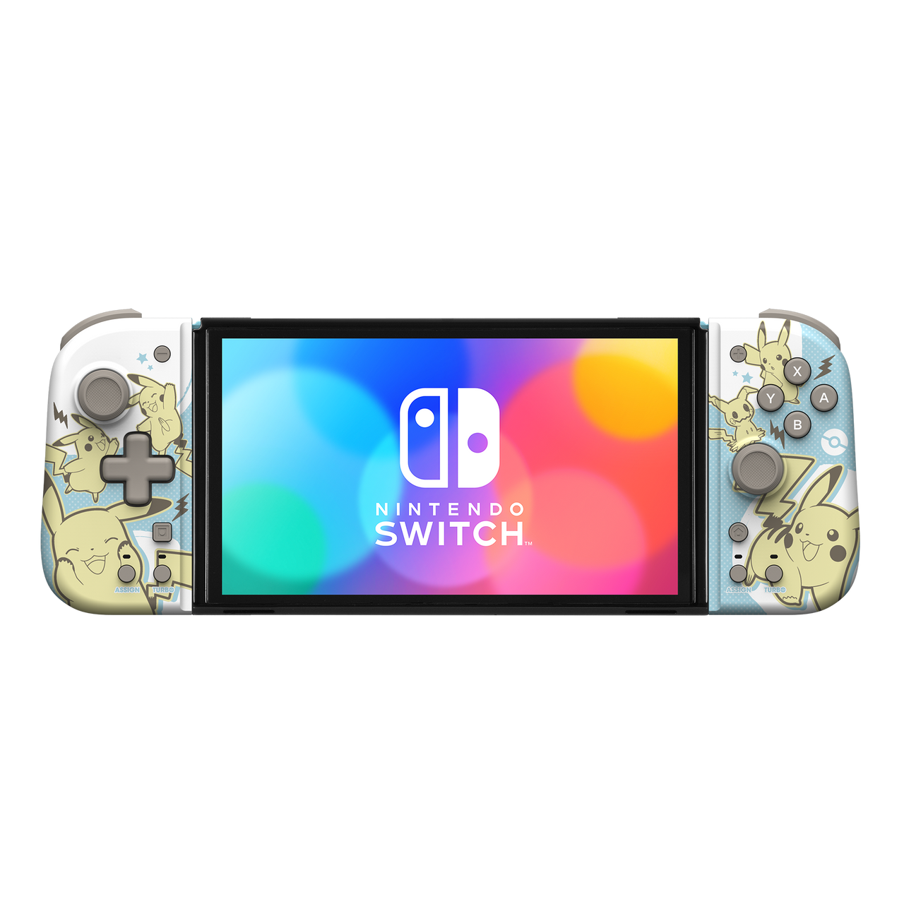 Introducing the newest member of the HORI Split Pad family - The Split Pad Compact (Pikachu & Mimikyu)! The Split Pad Compact provides a pro controller-like experience in Handheld Mode. Featuring comfortable and easy-to-use analog sticks, D-pad, and shoulder buttons. Advanced features include assignable rear triggers, Turbo functionality, and more. Great for a wide range of Nintendo Switch™ titles. The Split Pad Compact's ergonomic design fits your hands perfectly for increased comfort and control. Enjoy a new gaming experience with the Split Pad Compact! (Does not include Motion Controls, HD Rumble, NFC, or IR camera.) Officially Licensed by Nintendo & Pokémon